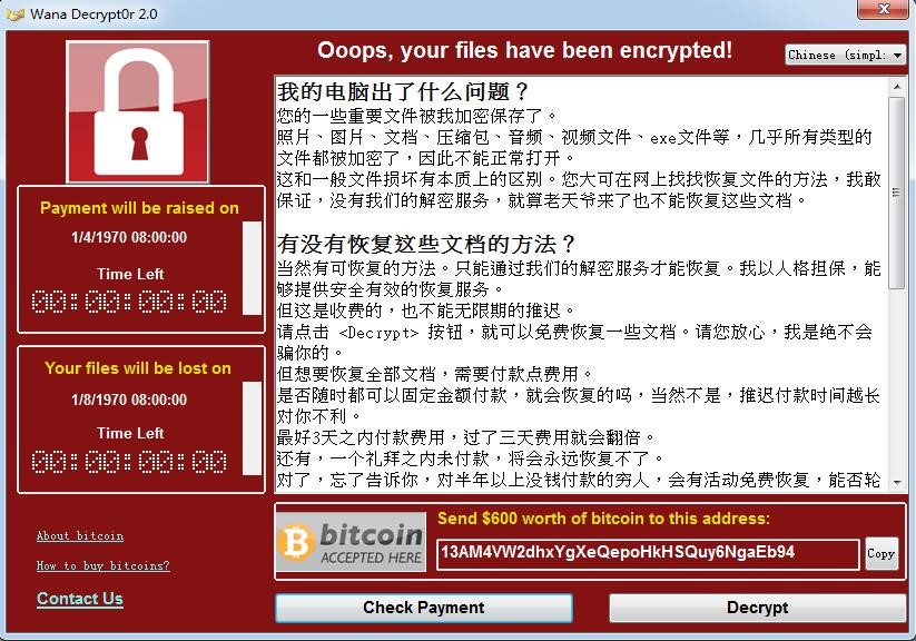 北京时间2017年5月12日晚,全球爆发大规模勒索软件感染事件,一个名为“永恒之蓝”的蠕虫勒索病毒波及近100个国家,包括英国、美国、中国、俄罗斯、西班牙和意大利,约7.5万台计算机被感染。国内多个高校校内网、大型企业内网和政府机构专网中招,危害目前仍在持续快速扩大。该病毒会加密电脑和服务器中几乎所有类型的文件,被加密的文件后缀名被统一修改为“.WNCRY”,感染者只有缴纳高额赎金(有的要比特币)才能解密资料和数据。