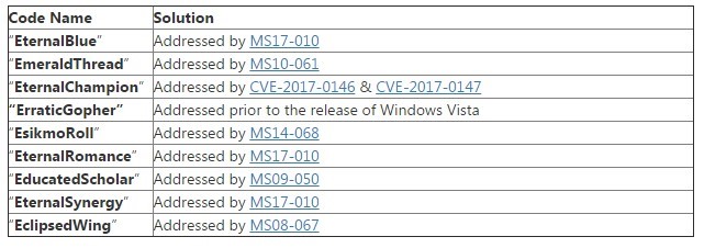 早在今年4月19日,方程式组织工具包被再次被公开,其中包含了多个Windows漏洞利用工具,影响多个Windows操作系统。漏洞针对Windows服务器的25、88、139、445、3389等端口漏洞远程执行命令,其中影响尤为严重的是445和3389端口。相应Windows漏洞及补丁信息如图所示: