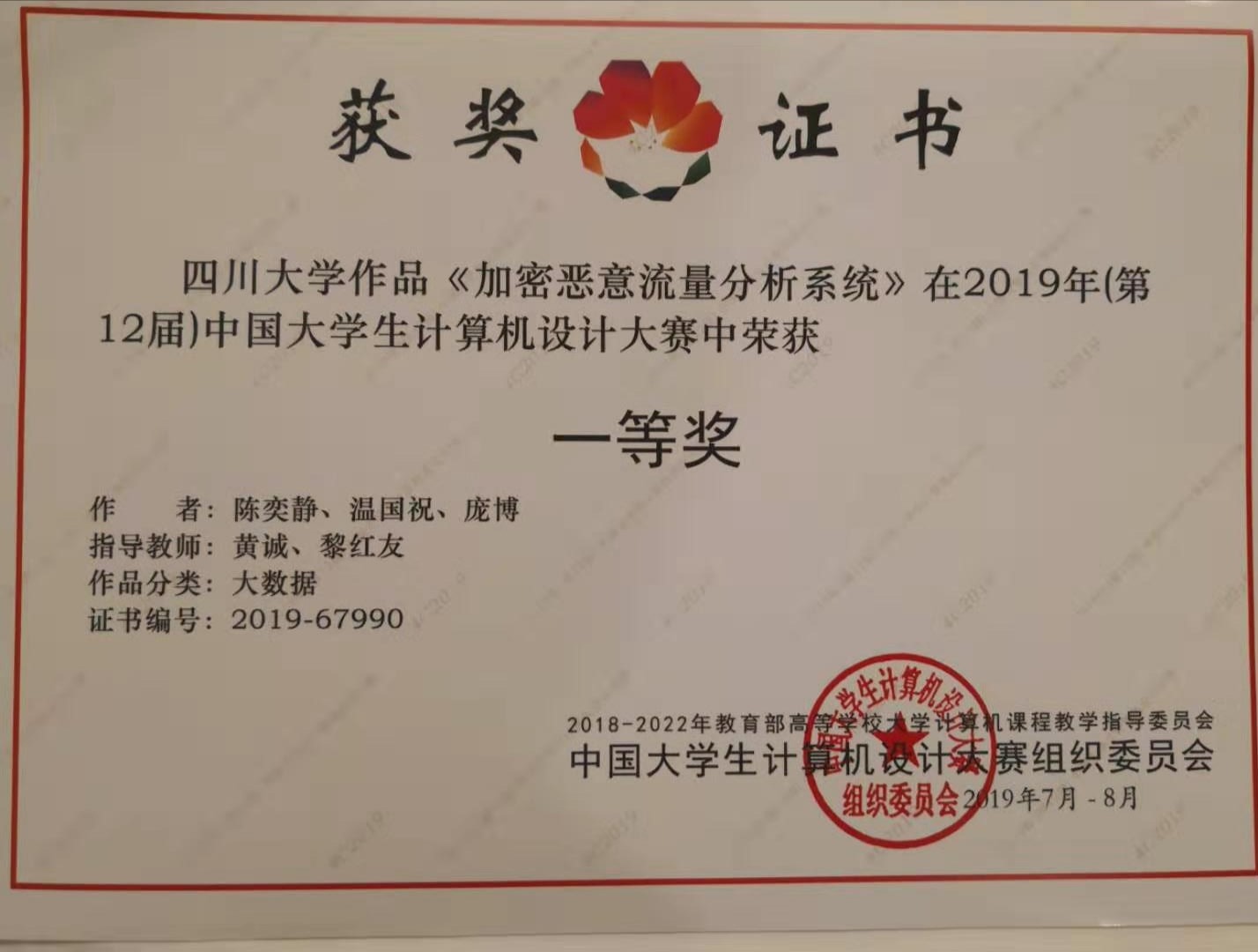 整个参赛过程中得到了公司领导们的高度重视与支持,由陈奕静、温国祝、庞博同学组成的公司参赛队伍,在黄诚老师、黎红友老师的悉心指导下队员们开拓创新,刻苦实践,完成的作品“加密恶意流量分析系统”,经过了四川省级赛的展示答辩,顺利晋级国赛,并在国赛中得到了评委老师的高度认可。