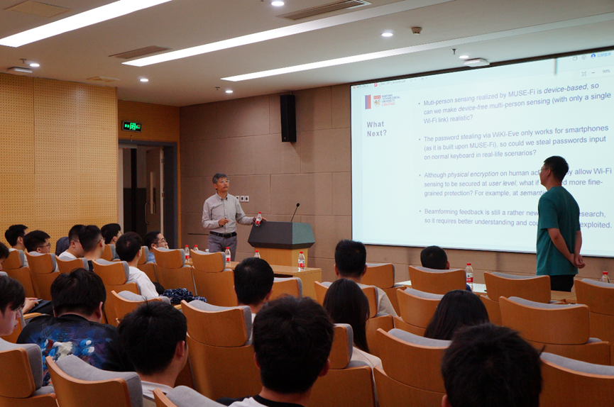在本次讲座上,罗教授为大家生动的讲述了物联网安全领域中基于商用Wi-Fi的感通一体化安全问题。罗教授首先讲解了Wi-Fi通信感知一体化中“Device-based sensing”和“Device-free sensing”两个重要研究分支及其基本原理,同时也简要介绍了其团队在Wi-Fi多人感知方面的研究成果;随后,罗教授指出了当前Wi-Fi通信感知一体化中存在的安全问题,深入浅出地讲解了Wi-Fi感知技术在网络安全领域的重要研究工作:利用Wi-Fi 的多入多出(Multiple-in Multiple-out, MIMO)功能对Wi-Fi信道进行物理加密,并创新性地采用密钥动态神经网络,为合法感知用户生成代理信道状态信息(Channel State Information, CSI),在向合法用户安全传输解密密钥时,可做到在窃听风险、感知准确性和通信质量之间取得平衡。此外,罗教授还展示了Wi-Fi感知技术可针对WeChat等应用程序在登录密码输入阶段对密码输入动作进行感知进而推测用户密码的可行性,介绍了综合利用Wi-Fi感知和音频分析对键盘敲击内容进行解析的可能性,以及简述了其他多项在Wi-Fi感知和通信领域的网络安全问题,并对未来研究方向进行了展望。