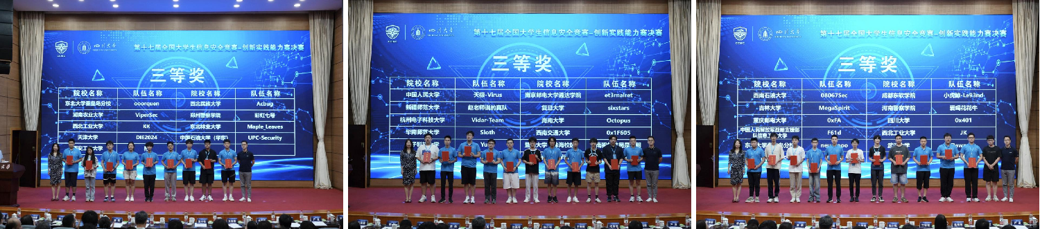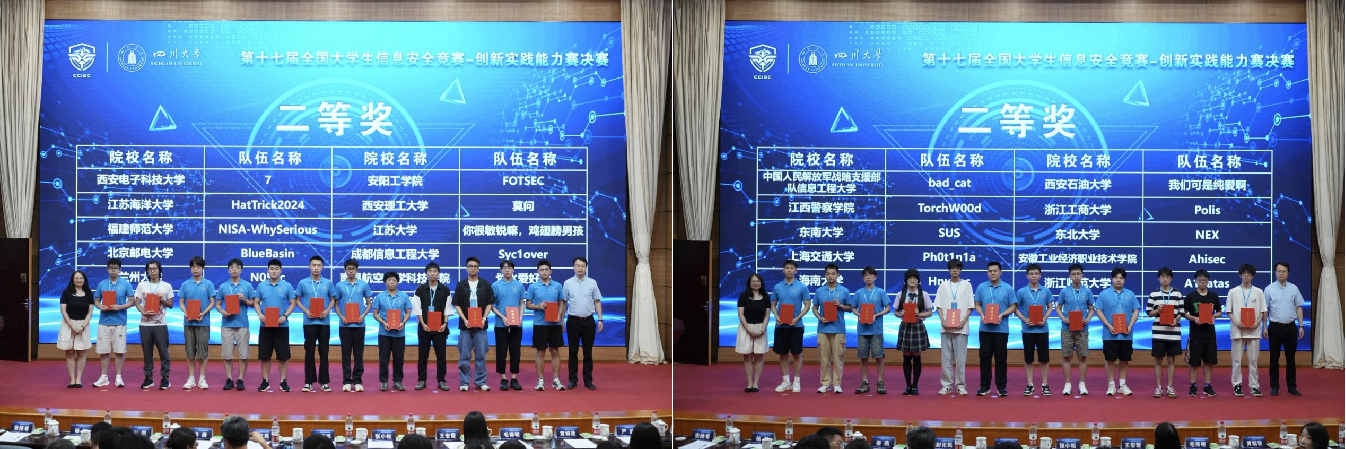 经过两天的激烈角逐,共产生全国一等奖22名、二等奖24名、三等奖33名。此外,组委会根据各个分赛项比赛情况,授予12支队伍网络安全挑战创新单项奖。