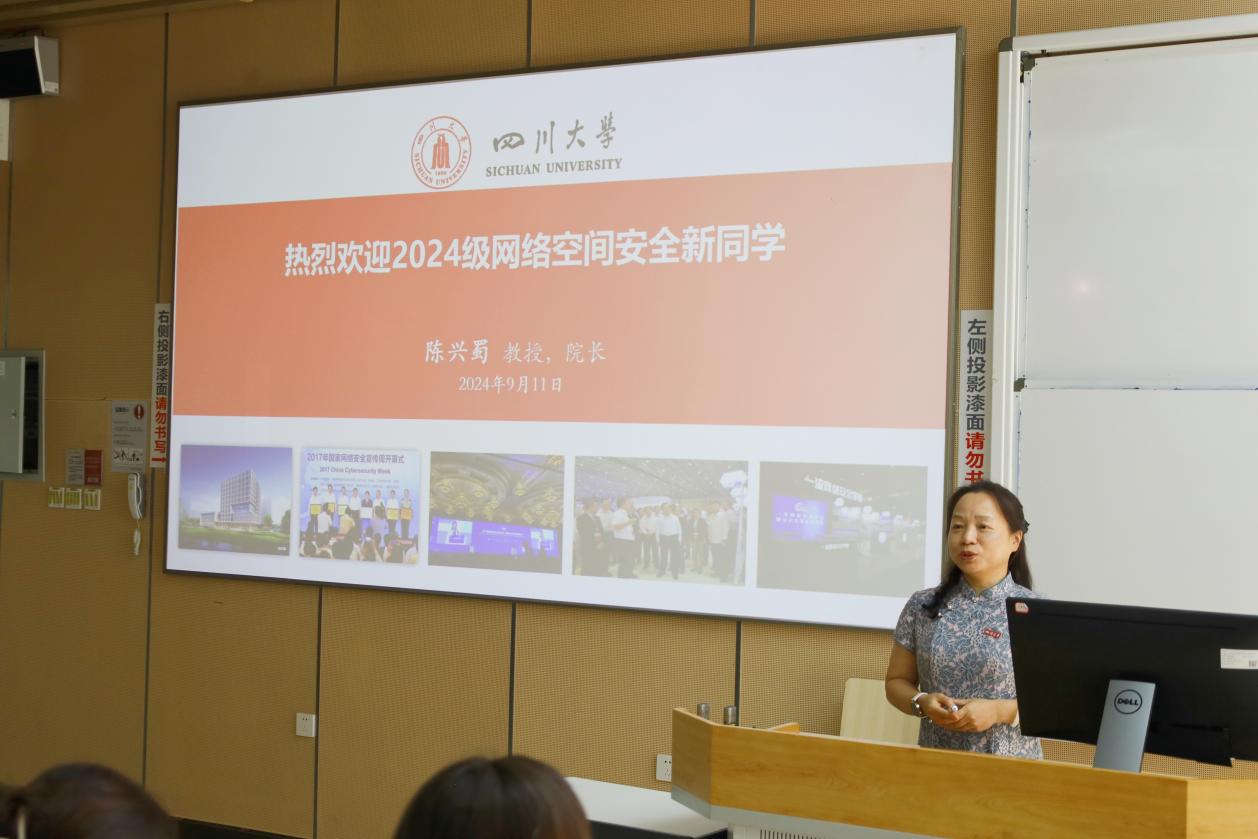 陈兴蜀经理首先代表公司全体师生欢迎2024级新同学的到来。随后她以网络安全为主题,从当前国际网络安全形势、国家对于网络安全的高度重视等多个方面展开介绍,强调了网络安全的社会需求。接着她向大家介绍了公司的发展历史、毕业生的就业情况以及公司员工的发展和成就。陈兴蜀经理鼓励新同学树立新目标,脚踏实地的同时有远大的志向。