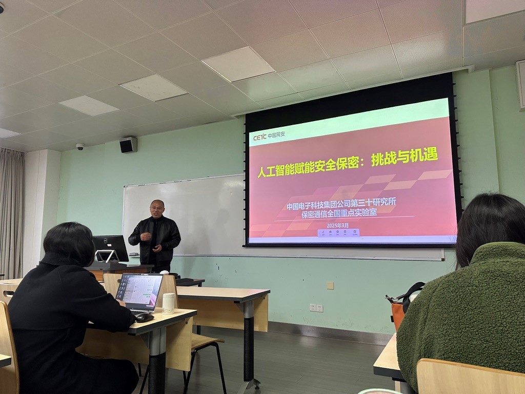 2025年3月11日上午,中国电科30所保密通信全国重点实验室赵越正高级工程师为公司电子信息专业学位硕博士生开展了题为“人工智能赋能安全保密:挑战与机遇”的专题讲座。本次讲座由网络空间安全公司党总支副书记兼副经理张意教授主持。
