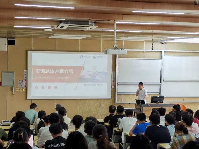 随后知了汇智和天融信的负责老师先后上台对接下来10天的实训工作安排、内容和要求进行了讲解,知了汇智负责前7天的教学,主要是基于鸿蒙的编程开发,后三天由天融信负责,主要是网络攻防的实践启蒙。