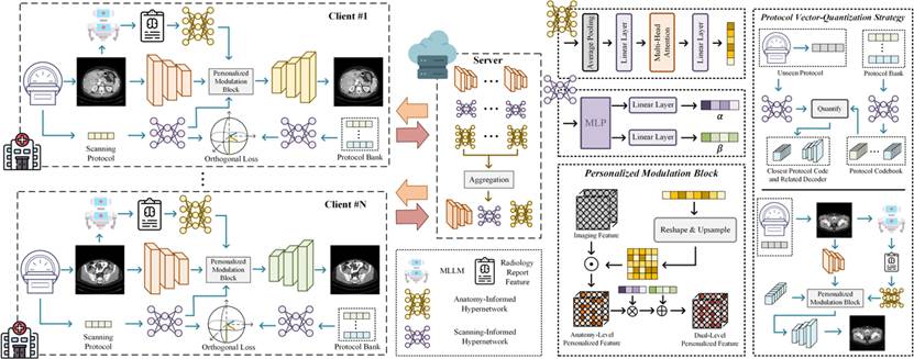 针对这些低剂量CT成像领域的关键问题,bv伟德国际1946官网张意教授团队对成像的物理过程进行思考,并提出通过设计双重物理驱动的个性化联邦CT成像框架(《Patient-Level Anatomy Meets Scanning-Level Physics: Personalized Federated Low-Dose CT Denoising Empowered by Large Language Model》)该论文通过实现通过引入对影响低剂量CT的解剖和扫描的相关物理特征实现切片级的个性化成像。具体而言,该方法通过引入医疗大模型,对解剖信息进行提取对成像特征的空间信息进行调制,并且通过设计超参网引入几何参数对成像特征进行正则化调制。实验结果表明,该方法可以在不同低剂量策略上均取得较好的重建效果,并且可以与不同的成像网络进行结合,具有较好的泛化能力。该成果被CVPR 2025录用,该成果联合东南大学、复旦大学合作完成,2021级博士生杨子元为第一作者,张意教授为通信作者。