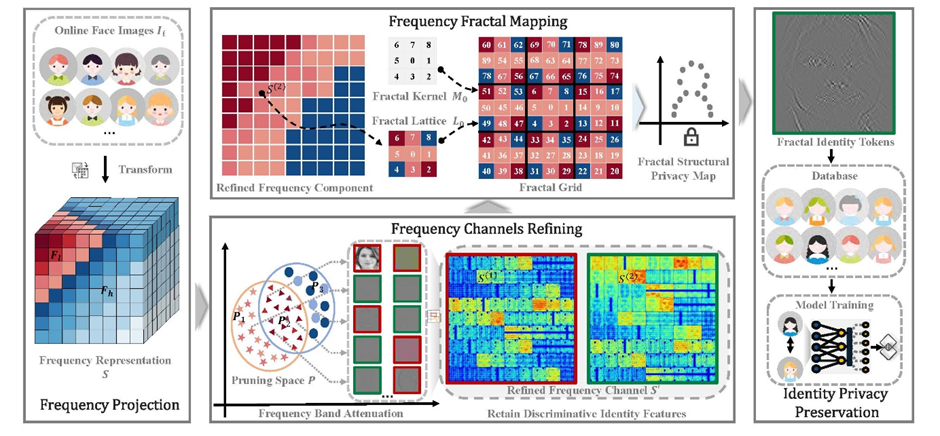 计算机网络与安全研究所李贝贝研究员课题组提出的 FracFace: Breaking the Visual Clues—Fractal-Based Privacy-Preserving Face Recognition,针对人脸识别中面临的重大隐私风险,创新性地设计了基于分形结构的隐私保护框架。具体来说,该研究通过提出频域通道精炼机制,有效降低频域稀疏性并抑制非身份特征,同时引入分形映射结构扰动深层表示,打破频域连续性,从而削弱可被生成模型利用的视觉线索,显著提升对重建攻击的抵御能力。实验结果表明,FracFace 在多个公开人脸识别基准上相较现有隐私保护方法,在白盒与黑盒攻击场景下的抗攻击性能提升15%–60%,同时保持了高水平的人脸识别准确率。该成果由公司作为成果第一单位,并联合新加坡国立大学与澳大利亚昆士兰大学共同完成,公司2022级博士生戴婉莹作为第一作者,李贝贝研究员担任共同通讯作者。