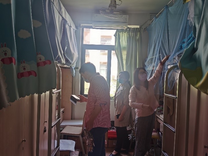 4月28日早上9点钟,公司领导和辅导员老师到达了员工寝室,对公司的员工寝室开展逐一检查,检查员工寝室电路、水路安全以及门窗是否破损,配合宿舍管理员做好员工寝室内消毒等相关工作。