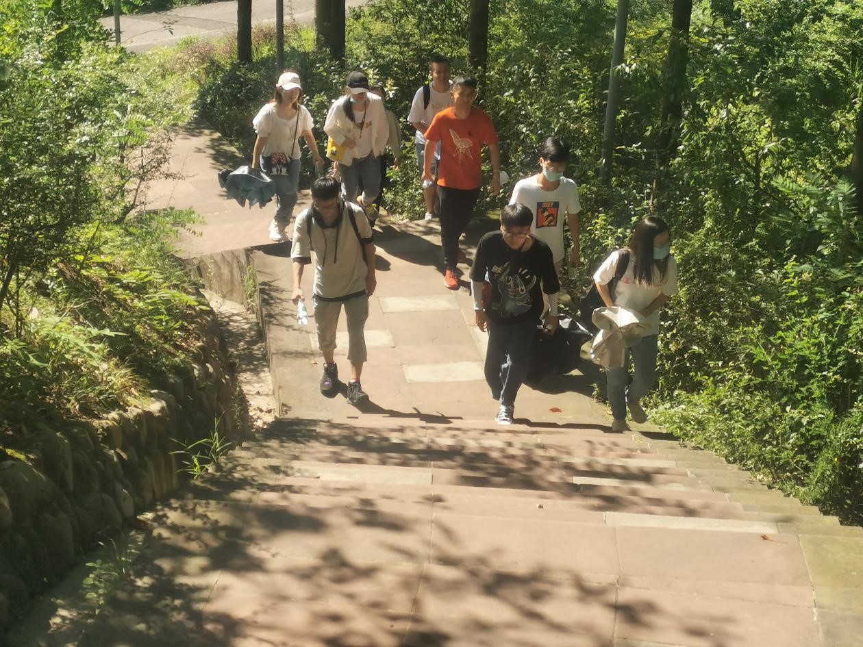 【实践团队在烈日下攀登红星公园长梯】