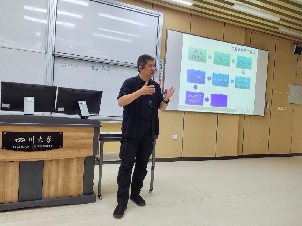 随后,潘老师围绕话题“质疑与思考”展开了此次讲座。他明确指出,网安专业的员工最不能缺少的就是一颗敢于质疑的心。在接下来的讲座中,他与同学们详细地分享了他对于网络安全专业领域的认识与思考,并给出了切实的建议。他通过一张九真图,将讲座分成了自己、价值、环境、竞逐、实干、前沿、深邃、理略、基础九个部分,并介绍了通过个人思考归纳出的两个专业人才成长路径:第一种是经由环境,奠定基础,参与竞逐,通过实干来进行实践,走向前沿并逐步接触专业本质的学术型人才的成长;第二种则是经由环境,定义价值,出谋划策后逐步接触专业本质的理论型人才的成长。讲座最精华的部分在于九真图中的“基础”部分。在这个部分中,潘老师深入浅出地讲述了学习网安必不可少的六门关键技术,分别为:系统、网络、数据、编程、密码学、硬件。潘老师就其了解的部分,将业界实例与课堂相结合,以生动的方式给出了独到的学习建议。譬如,潘老师通过小彩旗春晚上连续旋转数小时的例子告诉我们,水桶效应放到个人身上,就意味着我们在保住底的情况下,要将自己的长板发挥到极致。这些都对刚步入大学的同学们起到了启发和导向的作用。