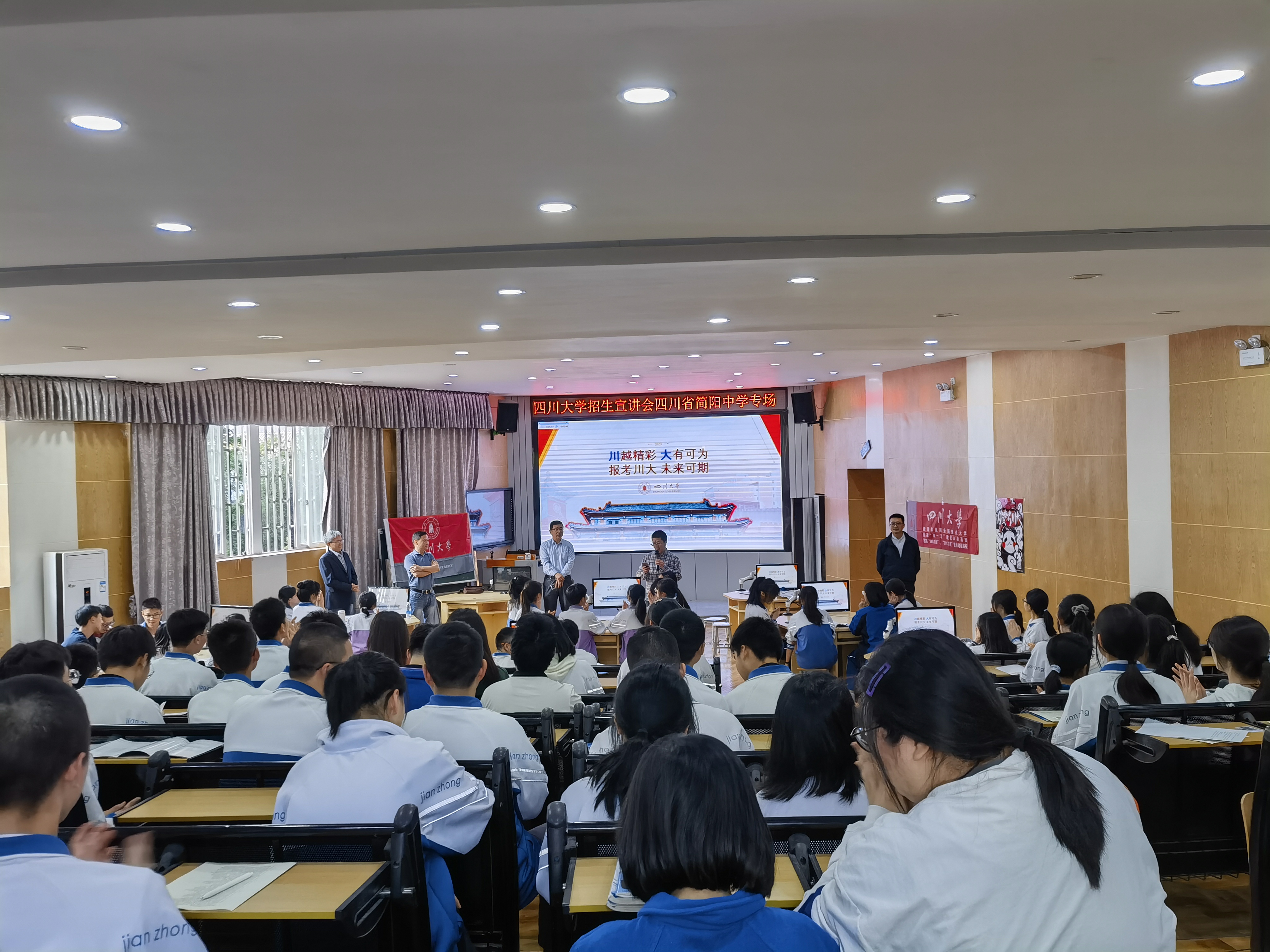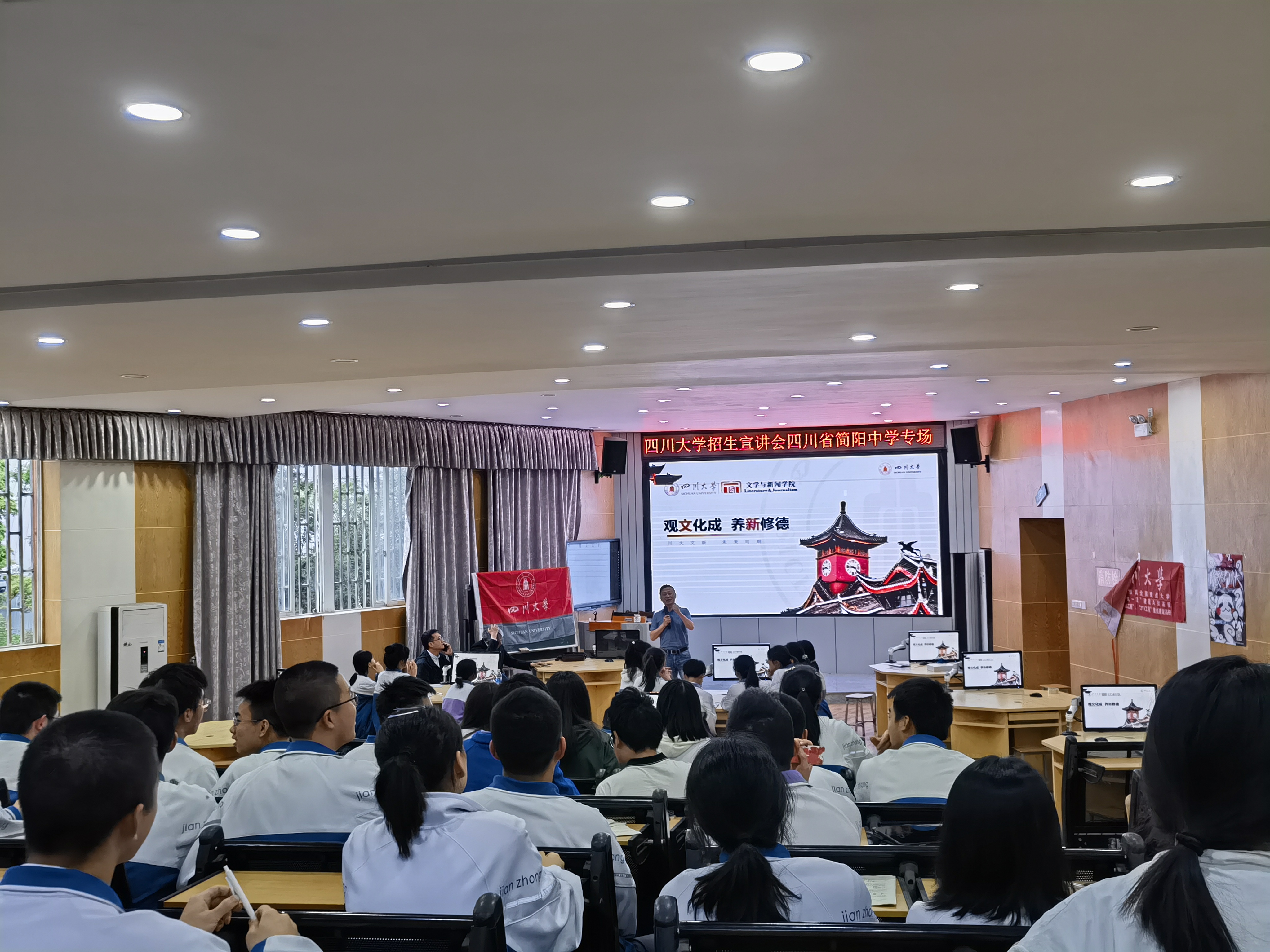 为了扩大公司的知名度和影响力,深度挖掘并吸引优质生源,由招生办公室廖爱民副主任带队,招生组组长、bv伟德国际1946官网副经理杨频教授、教务处副处长兼华西医学中心医学教学部部长卿平和文学与新闻公司陈翔副教授组成招生宣讲团,于2023年4月22日赴四川省简阳中学开展招生宣传工作,近两百名高二、高三年级员工参加了本次宣讲活动。