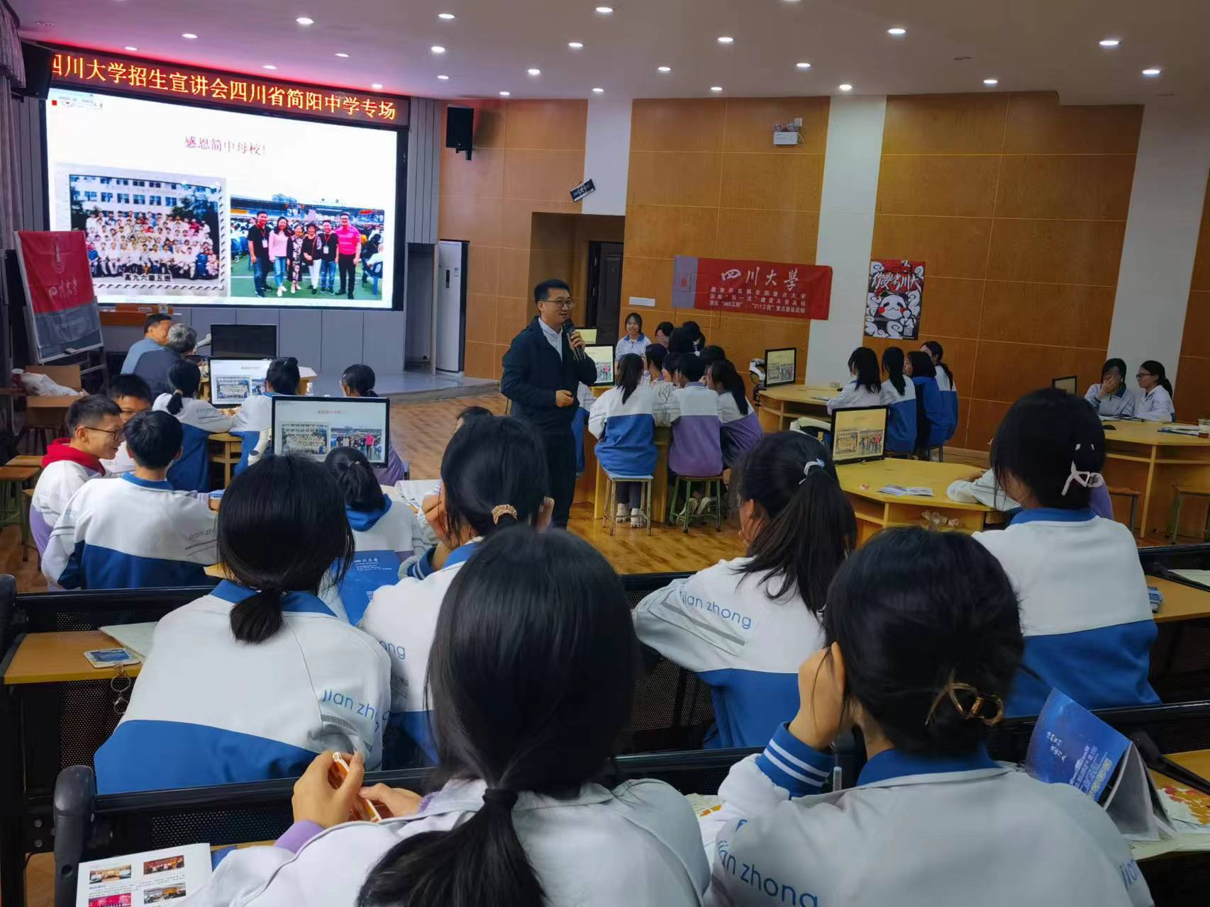 简阳中学高三年级主任苏波老师对公司招生宣讲嘉宾做了简要介绍之后,首先招生办公室廖爱民副主任围绕着川大的悠久办学历史、强大团队建设、特色人才培养、雄厚团队力量、舒适校园环境等方面系统而全面地介绍公司的办学实力和水平,吸引简阳中学的同学们报考川大。紧接着,廖主任对同学们最关心的bv伟德国际1946招生政策进行了详细解读,从强基计划、拔尖计划、工科试验班、中外合作办学、双学士学位等创新人才培养到入校后的转专业政策都一一为同学们解惑,最后表示非常欢迎和鼓励简中的同学积极报考公司。